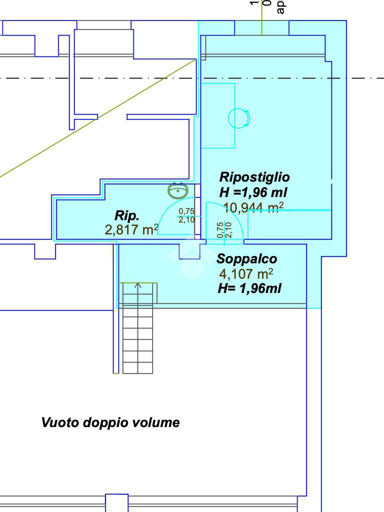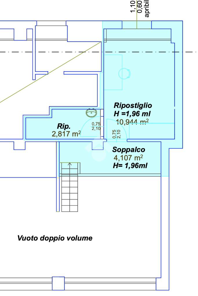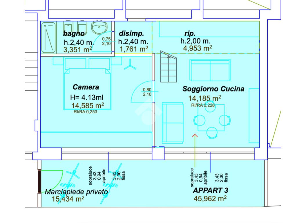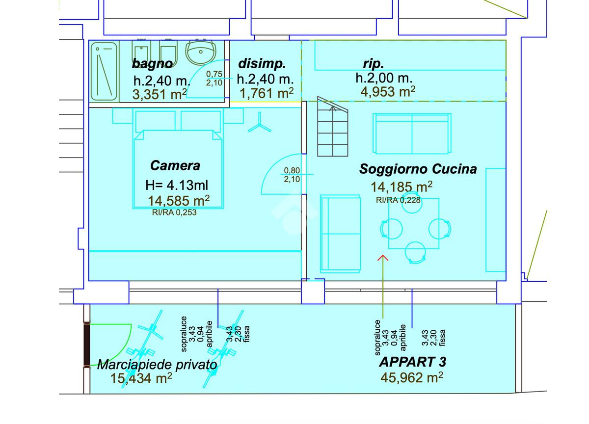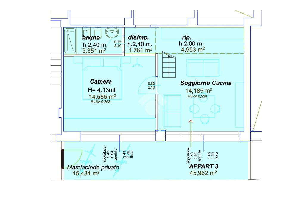 Soggiorno e camera godono di un altezza di 4mt garantendo uno spazio luminoso e arioso.