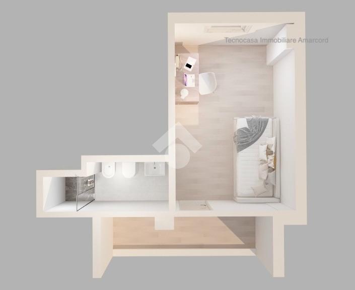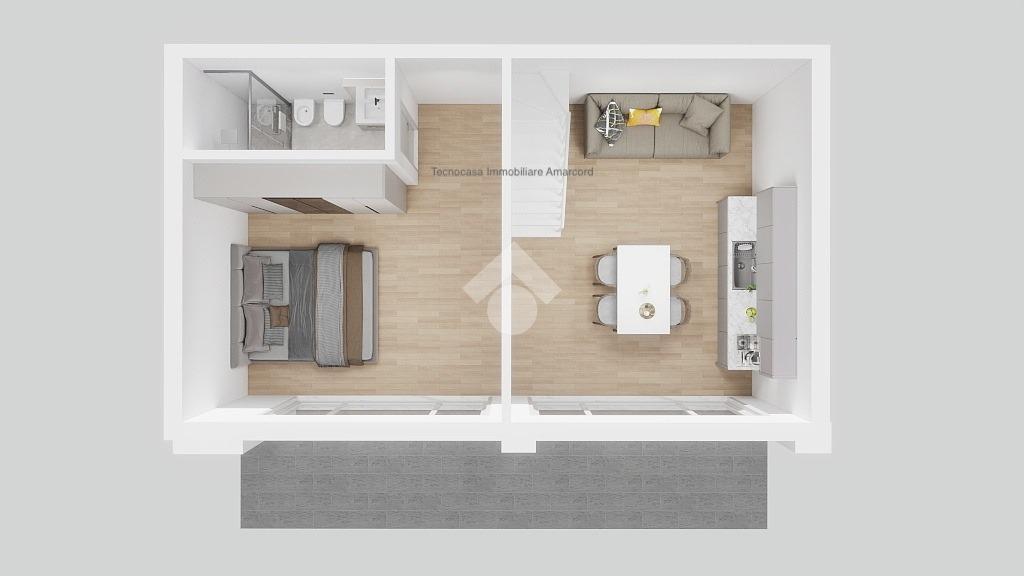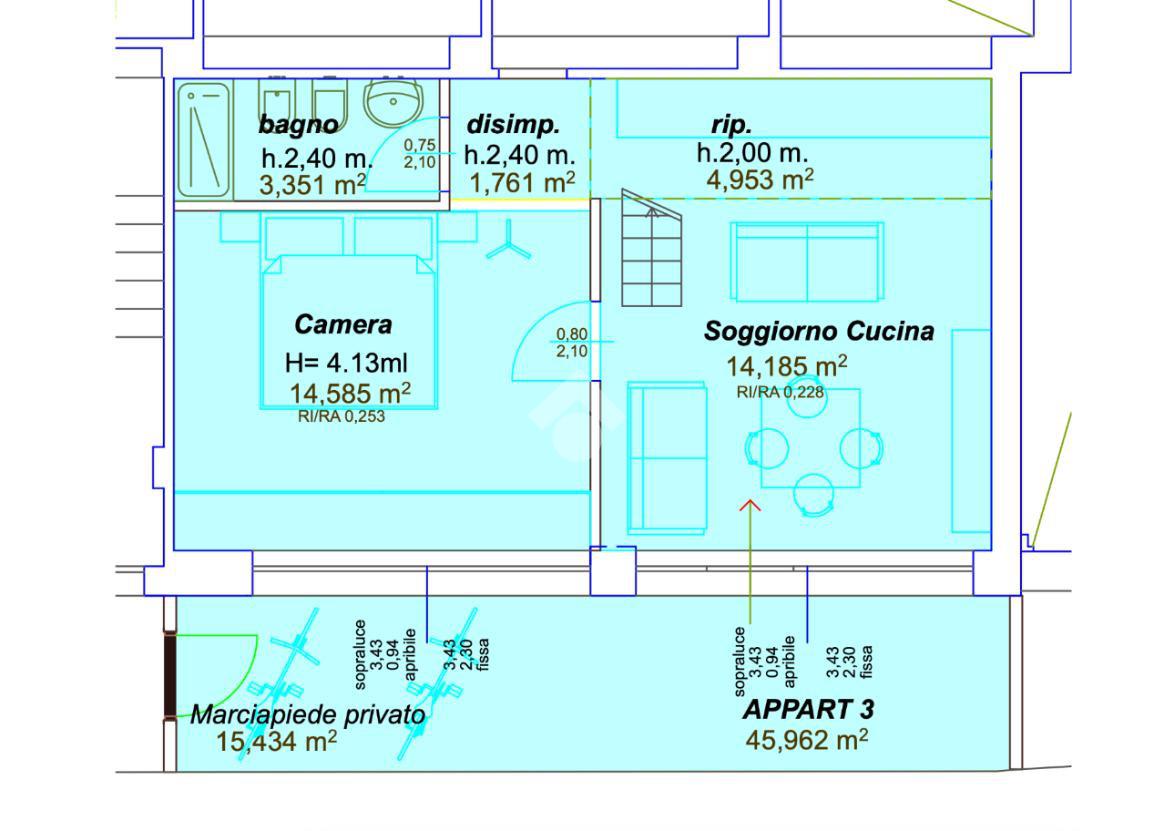 Ingresso indipendente su luminoso soggiorno con ampia vetrata di 3,5 mt con angolo cottura. Camera da letto matrimoniale con ampia vetrata. Bagno con box doccia.