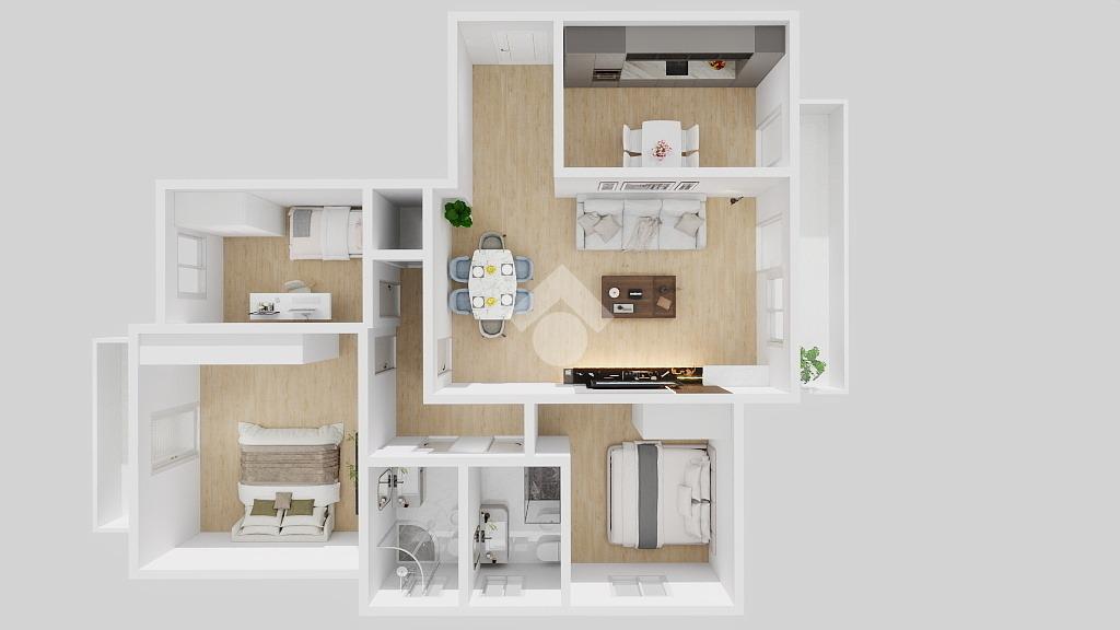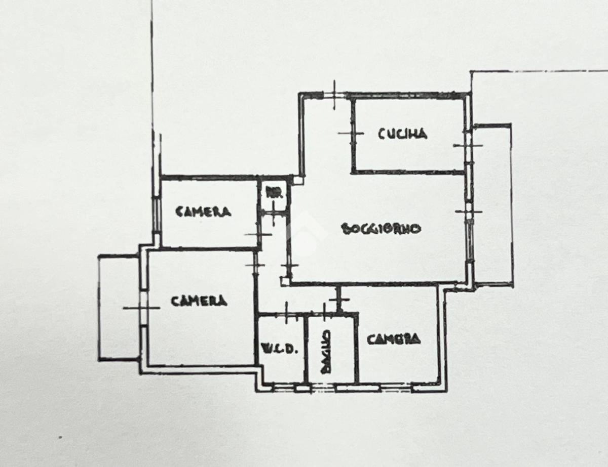 Composto da: soggiorno ampio e luminoso con camino, cucina abitabile, tre camere da letto, due bagni, ripostiglio e due balconi.
